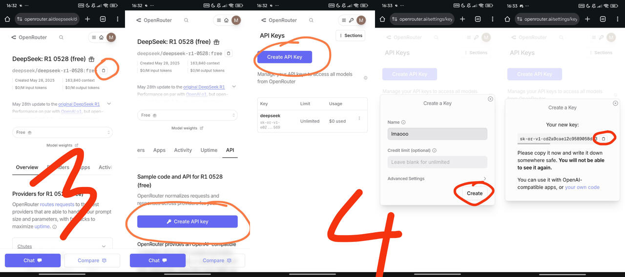 deepseek/deepseek-r1-0528:free for later to put it on your Janitorai proxy.4. Create your own Api Key. you can put whatever name in 'Create a key' Name section. leave the credit limit empty. Copy-paste the key you got. Don't forget to save your key elsewhere like in your notepad since you will never be able to see it again. (You can still create another new key, but the limit would still the same for one account)