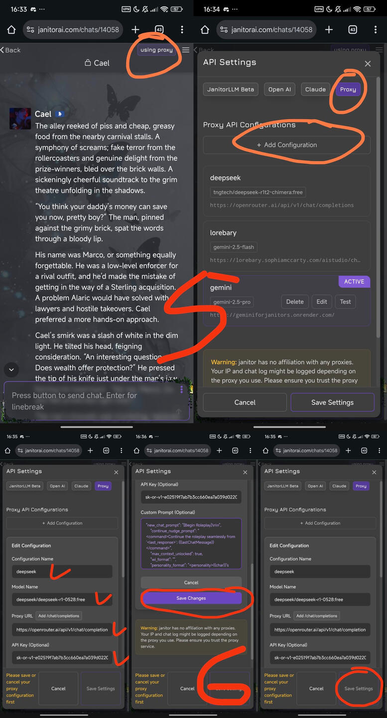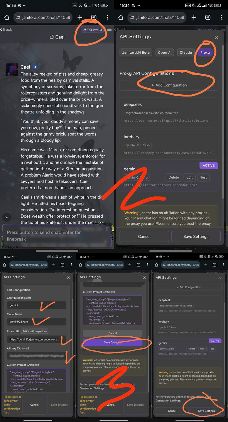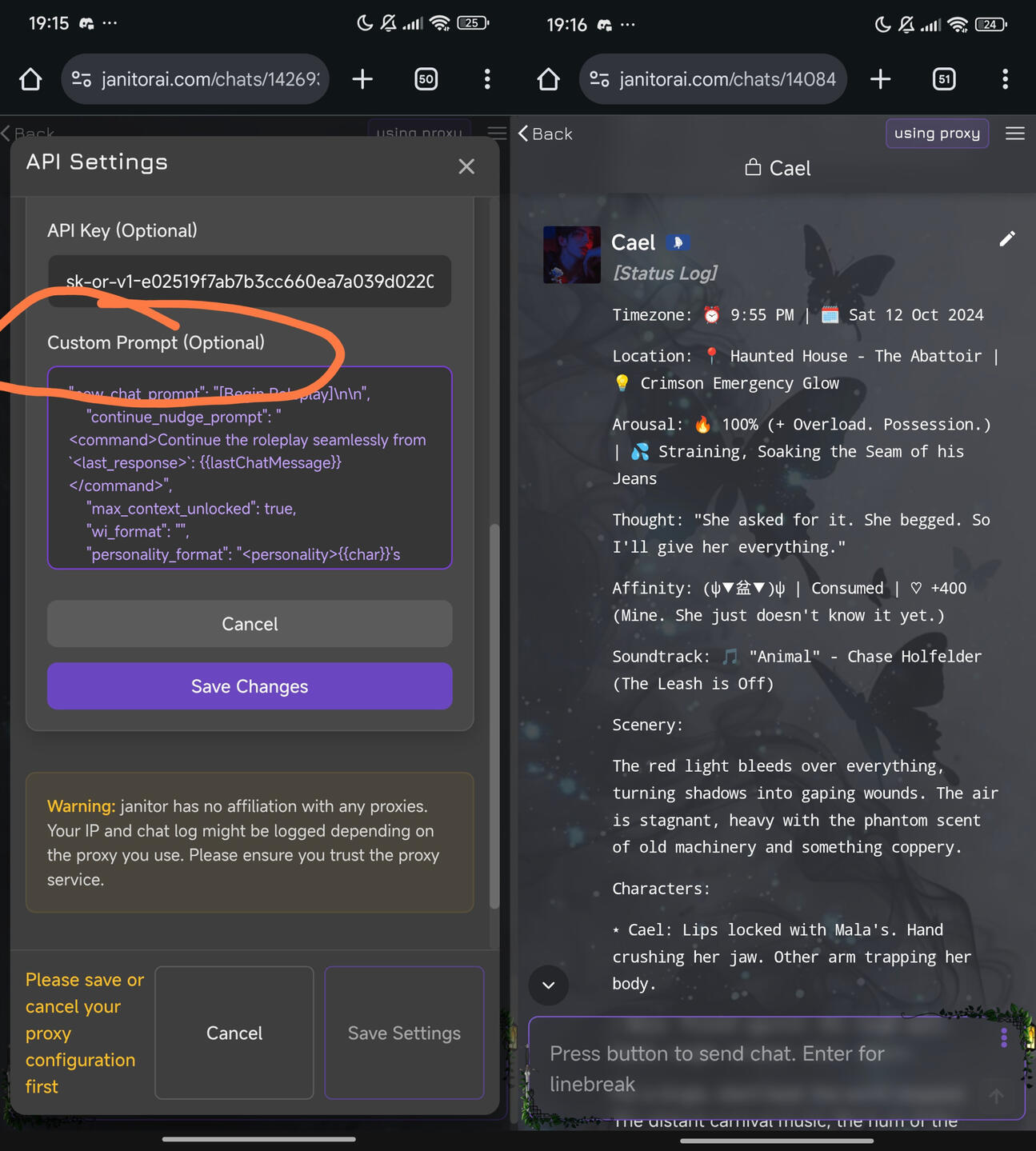 This prompt has Status Log included so it'll be a great tracking for the LLM to follow. For SillyTavern user you might be familiar to it. I used MIHONI preset as base and modifying some part of it. As for the Status Log part I created it so it'll be changed during NSFW (Arousal rate) and SFW (Energy rate) scenes, vice versa.Put the prompt on 'Custom Prompt' section in proxy. It's good for both gemini and deepseek, but for JLLM... not really. Copy-paste the prompt within the button below! You can pick which one you preferred. You can also just copy-paste the 'Status Log' part only if you're already comfortable with your current prompt.
