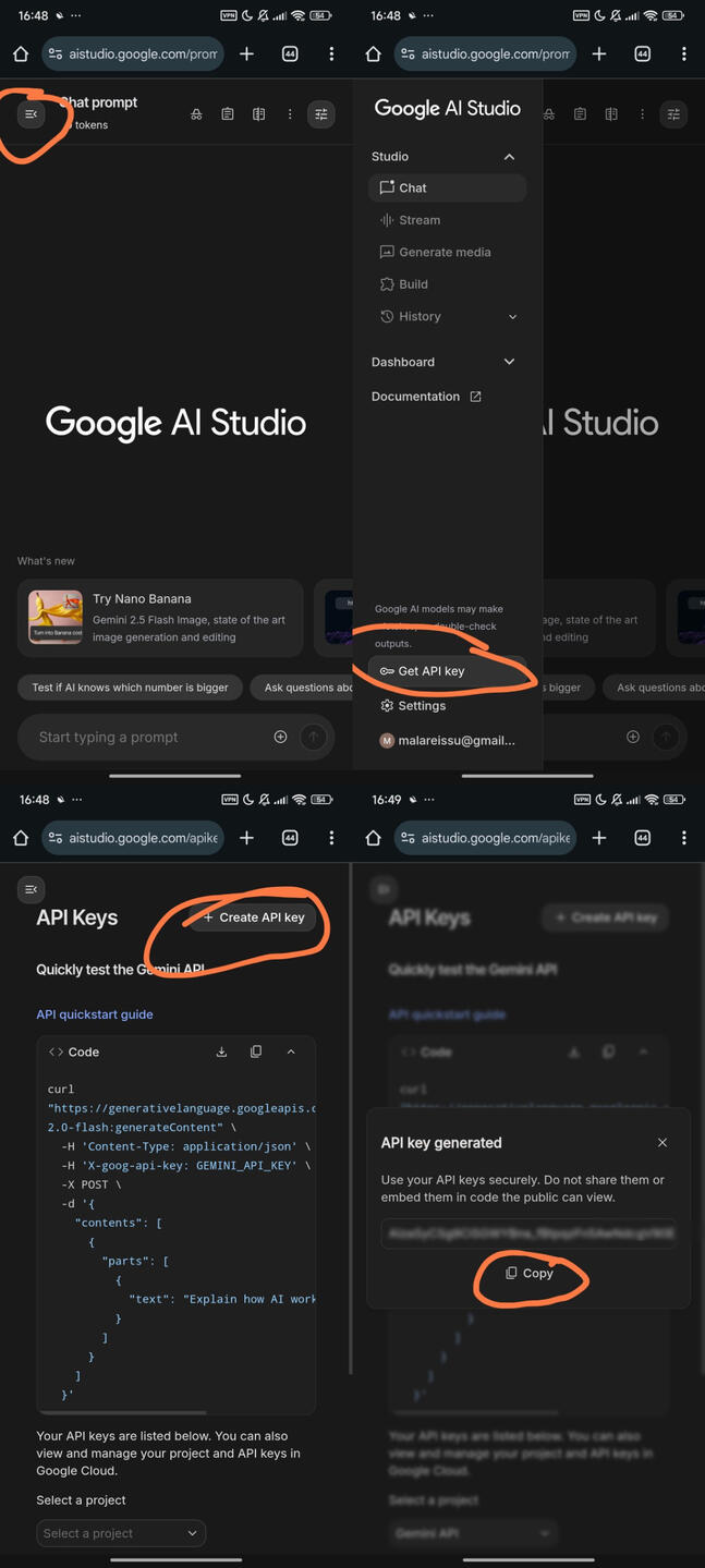 aistudio.google.com to create your own api key. Make sure your gmail acc is already signed in this site. Then click 'Get Api Key'. After that, click 'Create Api Key'. Then copy-paste the key you have and save them elsewhere like in notepad, because you won't see them again.